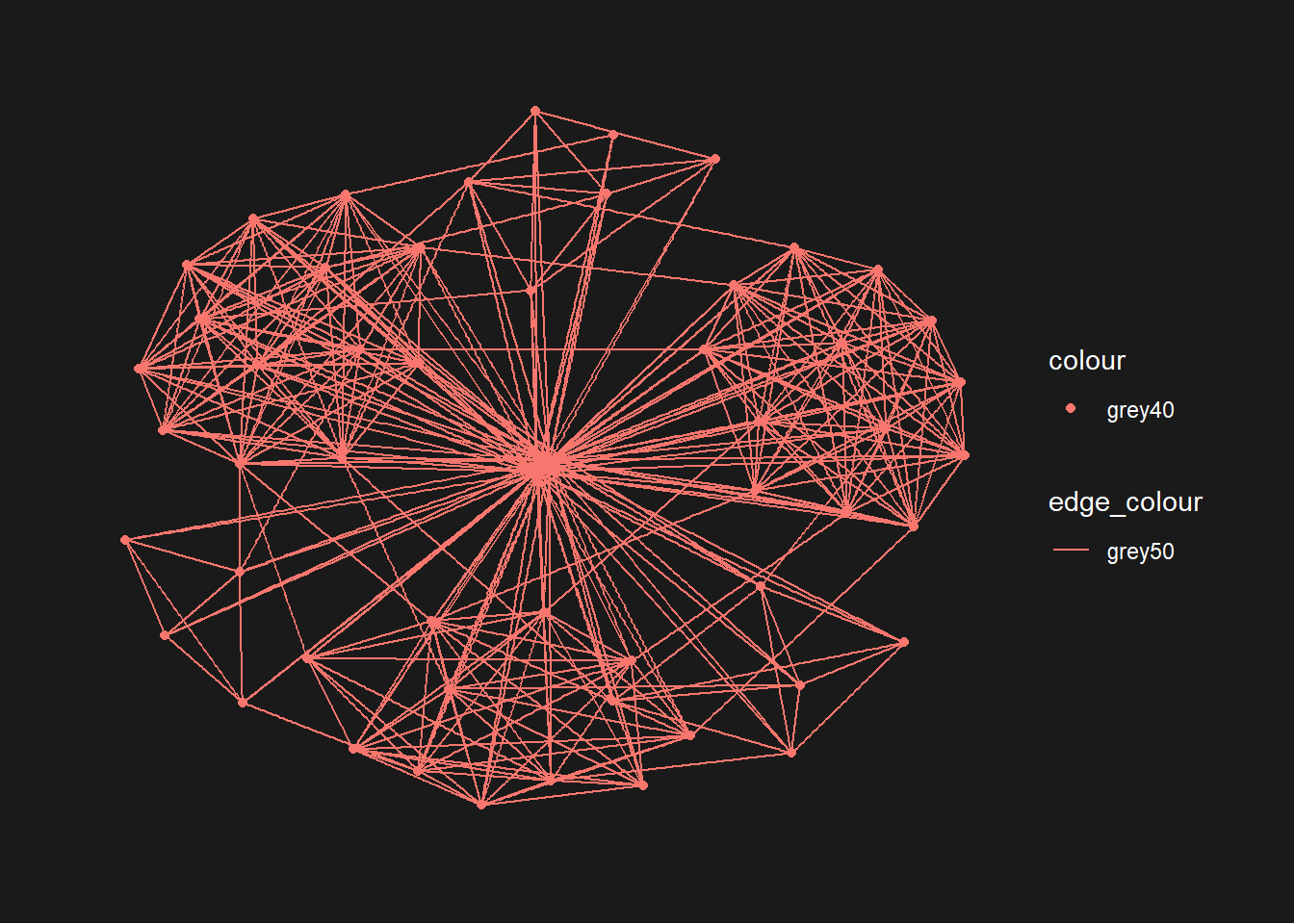 The basic plotting function is ggraph(), which takes the data to be used for the graph and the type of layout desired. Both of the arguments for ggraph() are built around igraph. Therefore, ggraph() can use either an igraph object or a tbl_graph object.