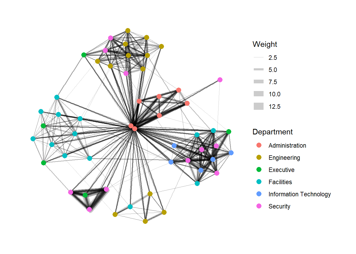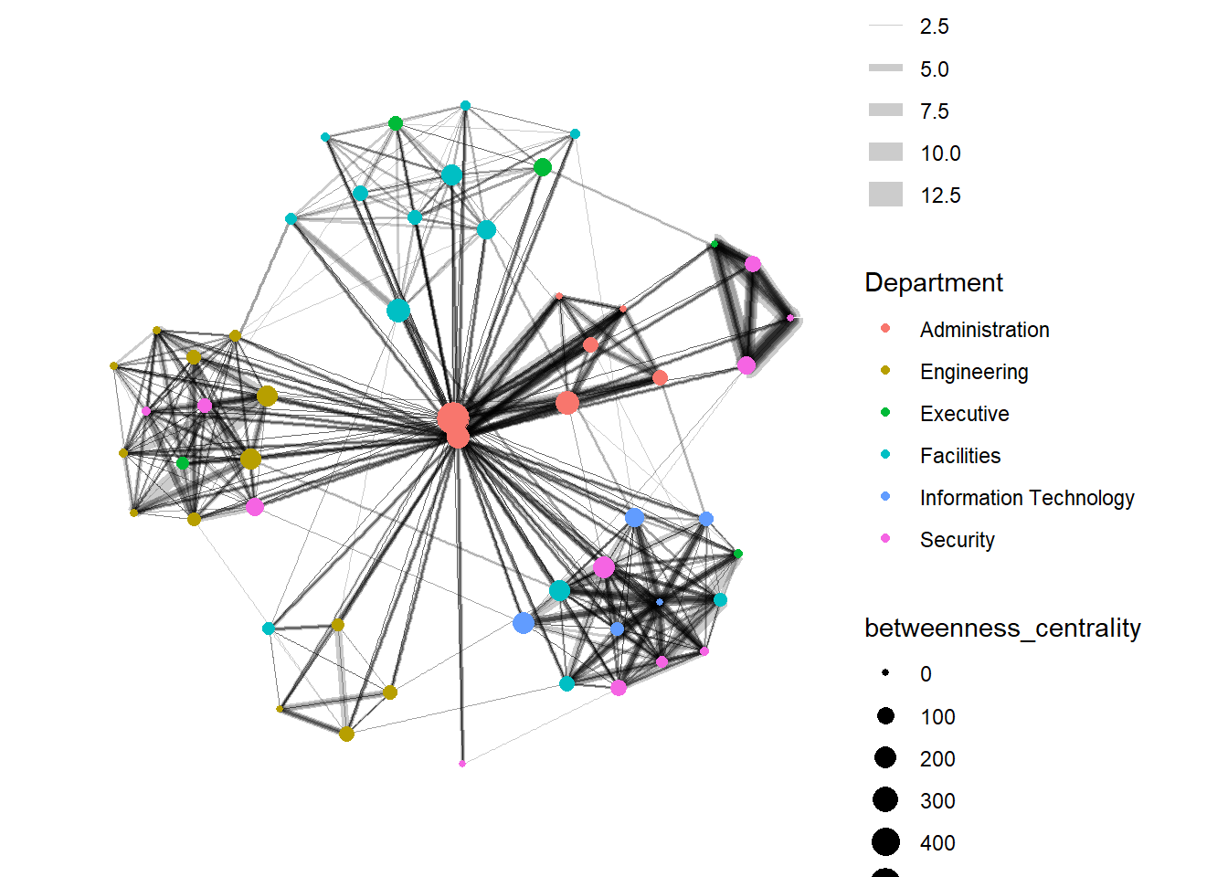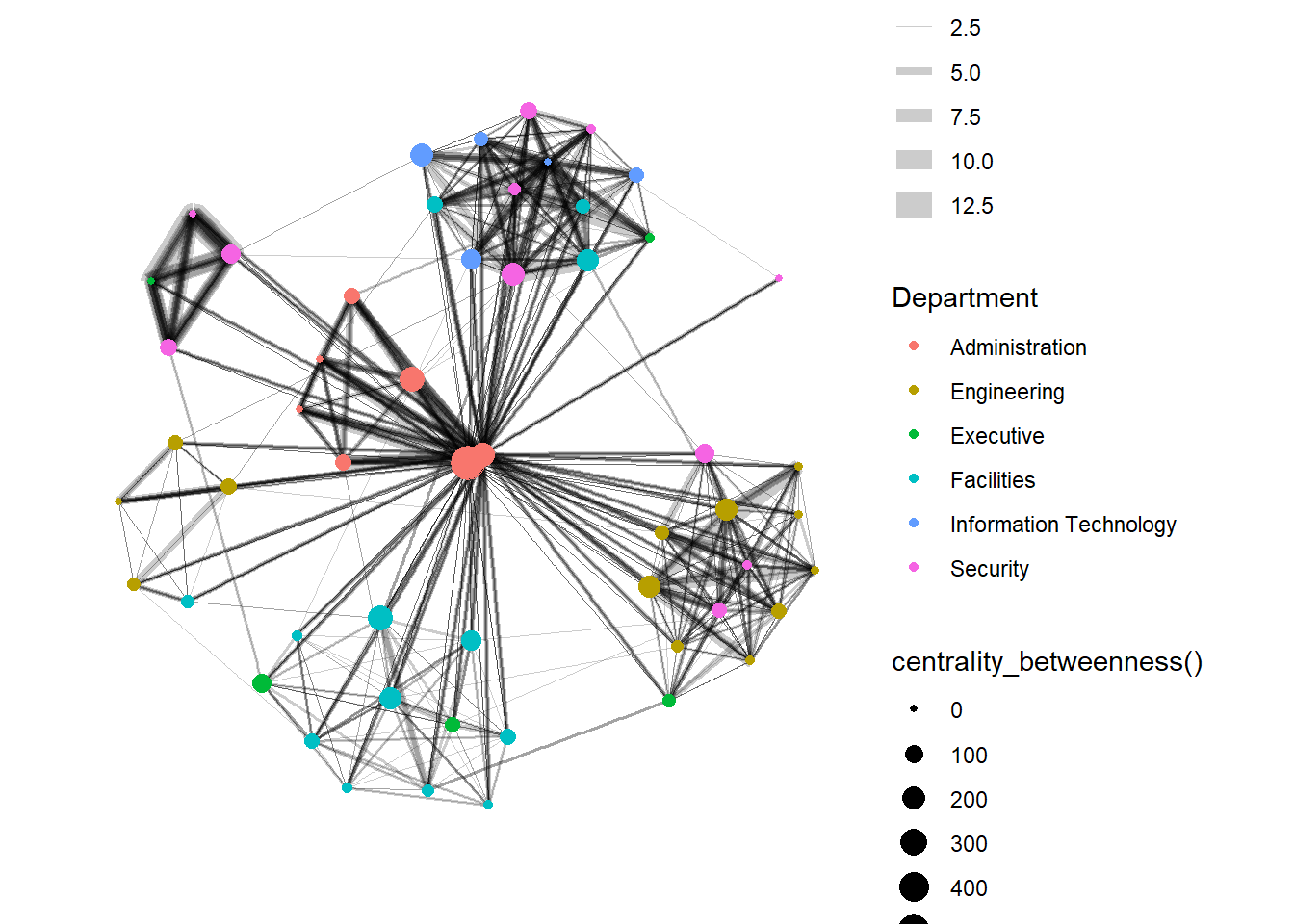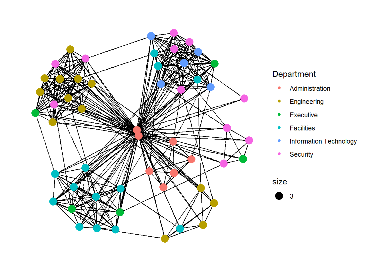 The nodes list must include an “id” column, and the edge list must have “from” and “to” columns. The function also plots the labels for the nodes, using the names of the actors from the “label” column in the node list. The resulting graph is fun to play around with.